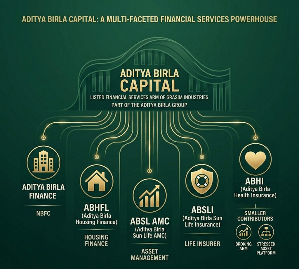 ABCL is the listed financial services arm of Grasim Industries, itself part of the Aditya Birla Group. It sits at the top of a structure that includes an NBFC (Aditya Birla Finance), a housing finance company (ABHFL), an asset management business (ABSL AMC), a life insurer (ABSLI), and a standalone health insurer (ABHI). There is also a broking arm and a stressed asset platform, though these are smaller contributors.