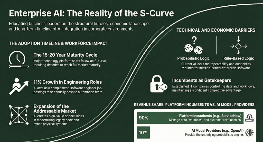 – Tech adoption follows the S-curve: S-curve adoption explains how new tech spreads over time. Growth starts slowly because there are few adopters and costs are high. Over time, as the value of the tech becomes evident, its adoption increases, and as the market matures, growth slows. This pattern of a slow start, a quick rise, and gradual slowing creates the S shape. Experts opine that while AI capabilities are advancing quickly, there are major integration and regulatory hurdles to be addressed. They posit that major technology platform shifts typically take 15-20 years to mature fully.