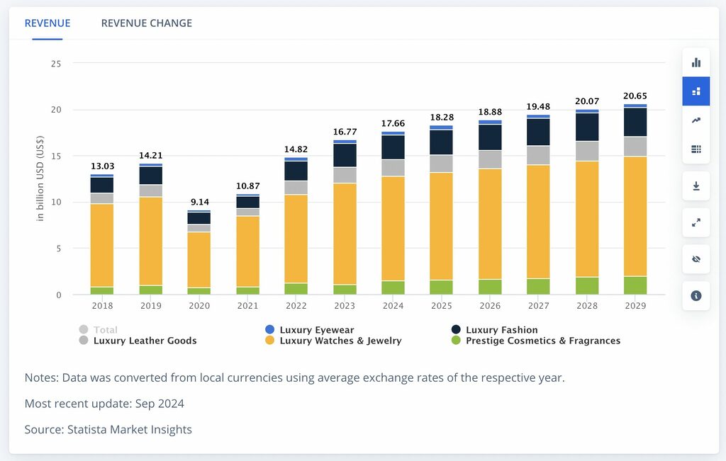 The global luxury industry has nine significant segments, with luxury cars, luxury hospitality, and personal luxury goods comprising over 80% of the market. Statista reports that India’s largest segment is luxury watches and jewellery, which will have a volume of $11.65 billion in 2025.