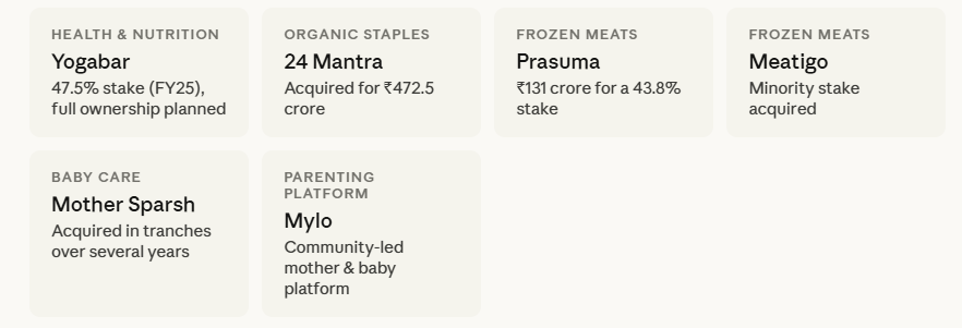 Over the past few years, ITC has built a portfolio of stakes and acquisitions that span nutrition, organic food, frozen meats, and baby care. These aren’t impulsive buys; each reflects a deliberate effort to enter categories where ITC lacks internal capability or where consumer trust is hard-won.