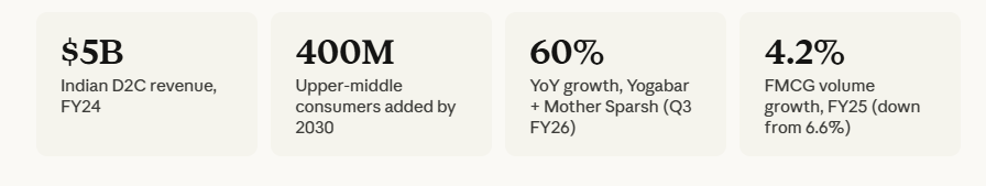- D2C has already won categories. Indian D2C brands collectively crossed $5 billion in revenue in FY24. Legacy firms have concluded that building competitive brands in these spaces from scratch would take longer and cost more than simply acquiring the winner.