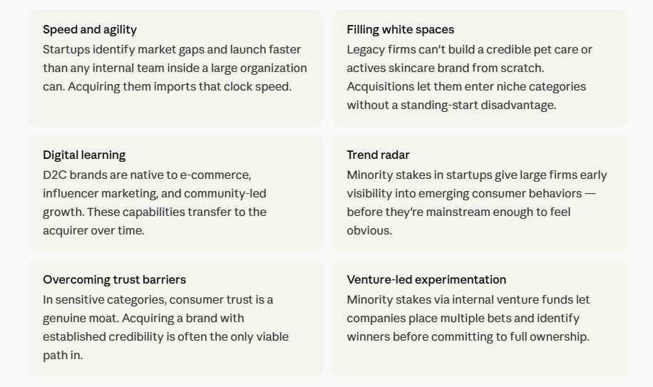 - Digital capabilities are hard to hire for. Performance marketing, social commerce, and community-building are competencies that startups develop by necessity and that large organizations struggle to cultivate internally. Acquisitions offer a shortcut.