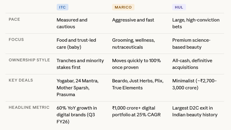 Legacy FMCG giants are no longer content building brands from scratch. ITC, Marico, and HUL are snapping up digital-first startups but each is doing it very differently.