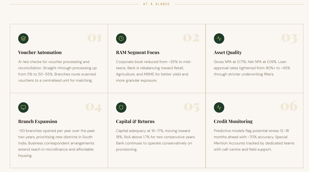 The lending mix has shifted materially. Corporate loans, which were around 35% of the book, are now in the mid-teens. The bank has moved toward retail, agriculture, and MSME — the RAM segment. Gross NPA has declined to 0.71%; net NPA stands at 0.19%. Loan approval rates have dropped from over 90% to around 45%, reflecting tighter underwriting rather than lower origination activity.