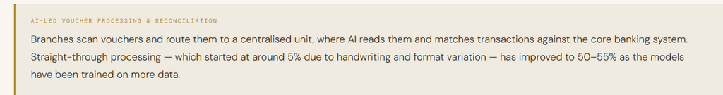 The bank is also looking at AI for customer profiling and identifying product needs earlier in the lending cycle. The focus, as Babu describes it, is on accuracy and efficiency rather than scale for its own sake.