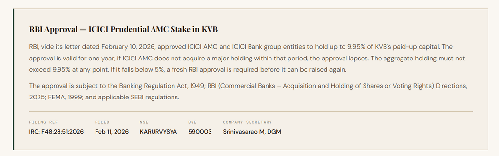 On the ownership side, there has been a development at the institutional level. In February 2026, RBI approved ICICI Prudential Asset Management Company (ICICI AMC), along with group entities of ICICI Bank Limited, to acquire an aggregate holding of up to 9.95% of KVB’s paid-up share capital or voting rights. The approval is a renewal — an earlier approval from December 2023 had lapsed, and this is the fresh sanction under similar terms.