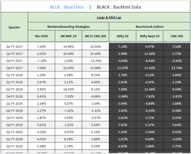 We have created a new tab in the HUB which tracks the monthly , quarterly & annual returns of all WeekendInvesting products segregated based on their market cap universe & compared to their respective benchmark indices. We have colored the backtest data in black while the real data is denoted in Blue. Please head to the HUB (monthly / quarterly / annual returns tab) to have a look and write to us should you have any questions.