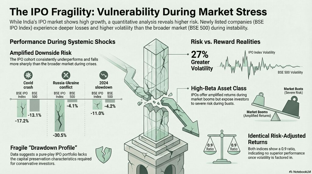 The true test of any asset class is its behavior when the tide goes out. The data suggests that the IPO cohort possesses a fragile “Drawdown Profile” during systemic shocks.