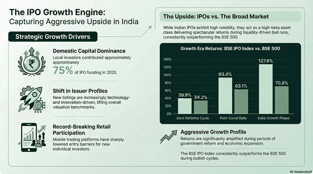 - The Reallocation of Household Savings: Since 2024, domestic investors have deployed ₹97,900 crore into IPOs, dwarfing the ₹79,000 crore from foreign institutional investors (FIIs).