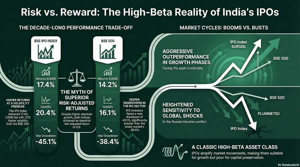 When we compare the BSE IPO Index against the diversified BSE 500 over the last ten years*, the “alpha” of newly listed companies begins to look less like magic and more like a mathematical trade-off.