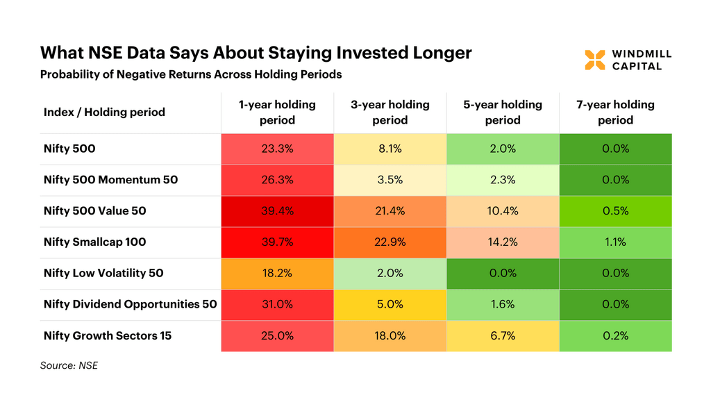 A strong strategy alone won’t guarantee success. The holding period is the real factor that determines outcomes. The probability-of-loss table shows this clearly: for the Nifty 500, the chance of negative returns decreases from 23% over one year to 0% over seven years. Even higher-volatility segments like small caps drop from about 40% to nearly zero over time. Factor strategies tend to have cycles. Value can struggle for a longer time, with a 39% chance of a one-year loss. Momentum stabilises faster, showing only a 3.5% chance of loss over three years. Low volatility consistently protects capital, with no losses beyond five years. Exiting early only captures short-term noise, whereas staying invested through full market cycles allows for mean reversion, trend persistence, and systematic compounding to reveal the strategy’s true advantages.