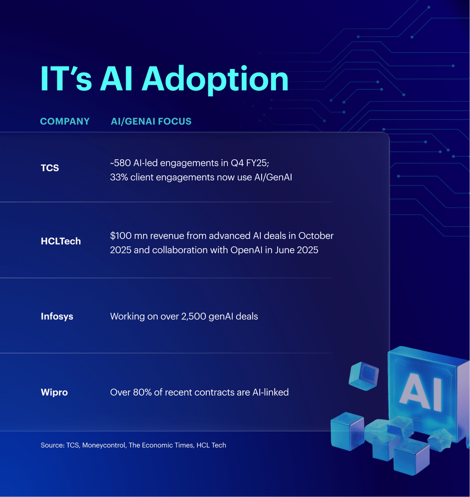 AI disruption forces investors to re‑examine those assumptions. Research estimates that AI-led engagements account for about 74% of large contracts signed over the past few quarters.