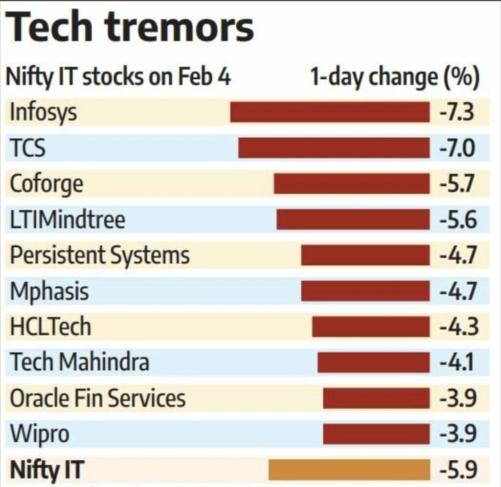 Back home, the Nifty IT index plunged around 6% on February 4, in its worst single‑day fall since the COVID-19 crash, wiping out roughly ₹1.9–₹2 lakh crore of market value. Names like Infosys, TCS, HCLTech, LTIMindtree, Coforge and Mphasis were down 5–7% in a matter of hours.