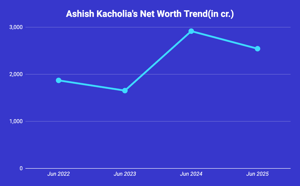 As of the latest available data, Ashish Kacholia’s net worth is estimated to be more than ₹2,598.55 cr. This valuation is based on his holdings in 48 listed companies, as per corporate shareholding disclosures up to June 2025. Some of the factors that are helping to increase his net worth include his investments in Gujarat Apollo Industries and increased stakes in Tanfac Industries and Aeroflex Industries. While a few stocks saw profit declines, overall, his portfolio benefited from strong performers. Here is a graphical representation of Ashish Kacholia’s net worth throughout the years.