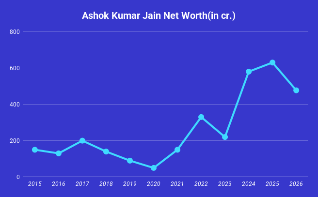 Ashok Jain’s net worth trend shows a gradual rise with periods of sharp volatility. The portfolio declined between 2018 and 2020, followed by a strong recovery from 2021 onwards. The value increased significantly in 2022 and 2024, reflecting phases of strong portfolio performance. While the net worth reached higher levels around 2025, the latest figure for 2026 stands at 477.1 cr., indicating a moderation from recent peaks. Overall, the trend highlights how portfolio value can fluctuate with market cycles and stock-specific movements.