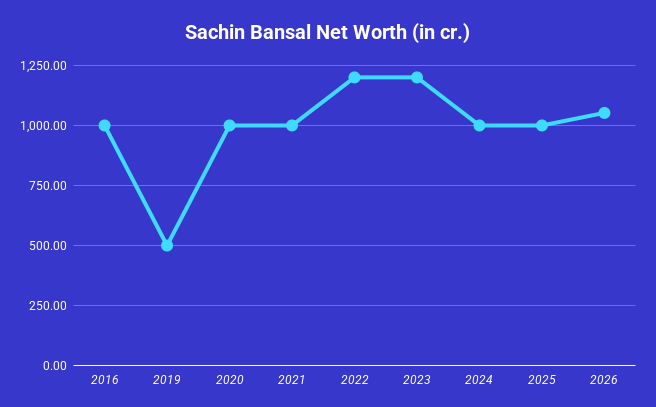 Flipkart’s founder’s net worth trend shows phases of decline and recovery over time. The chart indicates a sharp drop around 2019, followed by a recovery in 2020 and stability through 2021. The portfolio value increased further in 2022 and 2023, before moderating from 2024 onwards. The latest net worth stands at ₹1,052.2 cr in 2026, reflecting a relatively stable position after earlier fluctuations. Overall, the trend highlights how portfolio value can move with market conditions and changes in disclosed holdings.